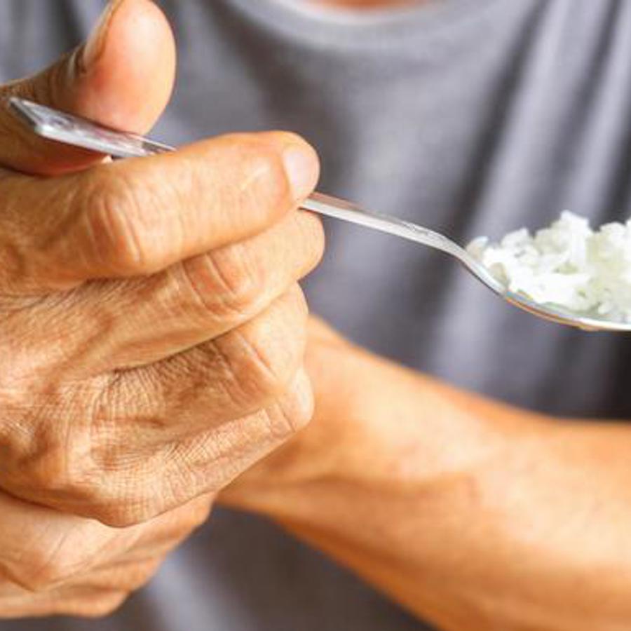 Elderly hand holding spoon.