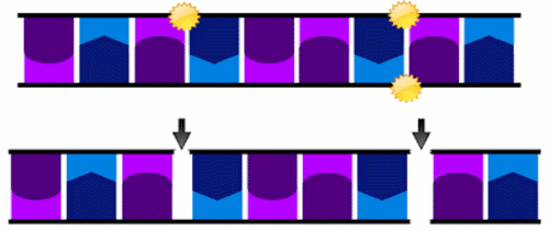 UV radiation in sunlight can damage your DNA by messing up the base pairing. UV light will often make two T's that are next to each other stick together making something called a dimer. Our cells have ways to fix this problem but if there are too many TT pairs, your cells can't deal very well with it.