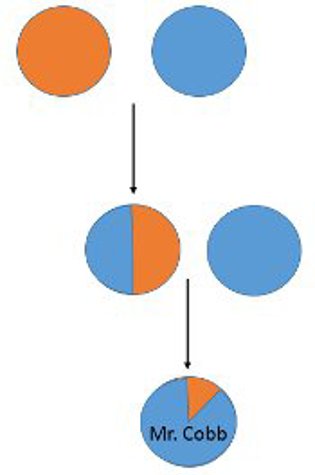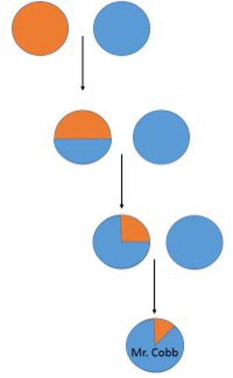 To show where the 14% comes from, let’s start with Mr. Cobb’s great grandparent. We will say his DNA is 100% sub Saharan African. We will represent this as an orange circle like this:
