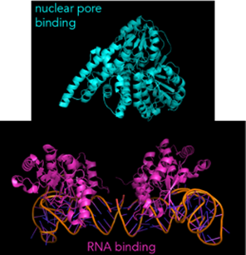 These helper proteins are usually made up of two important parts. One part grabs on to the RNA. The other part binds to the nuclear pore. Together, these two parts act like a magnet that guides the mRNA exactly where it needs to go.