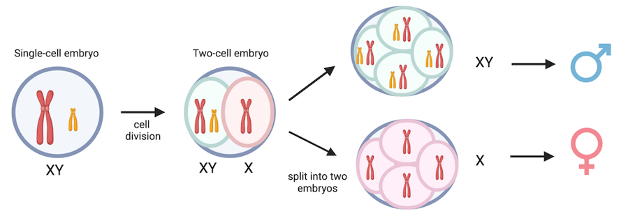 While it’s extremely unusual, there have been several dozen examples like this of identical twins who were born different sexes6. This usually happens when a male embryo (with XY chromosomes) splits into twins, and then one twin loses the Y chromosome. In those cases, one twin will be born male (XY chromosomes) and the other will be born female (with a single X chromosome).