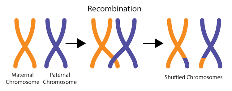 Most of the chromosomes trade bits with each other each generation. This recombination happens when sperm and egg are made. The two copies of chromosome 1 line up against each other and swap pieces. Then, one of those shuffled chromosomes gets passed onto the kid.