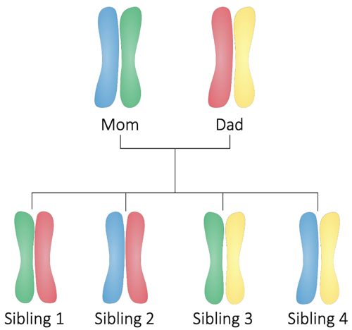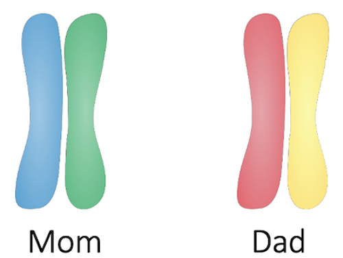 Imagine your parents each have two different chromatids for one particular chromosome. For this example, we’ll identify them by color. Let’s say your mom has a blue chromatid and a green chromatid, while your dad has a yellow chromatid and a red chromatid.
