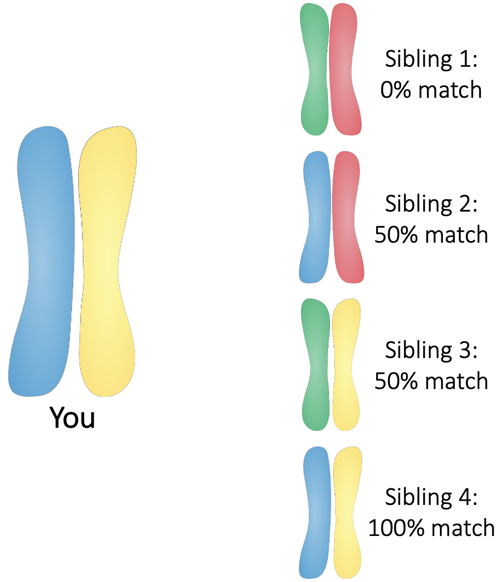 If your sibling also had a blue chromatid and a yellow chromatid, you would have identical copies of that chromosome. You’d be a 100% match!